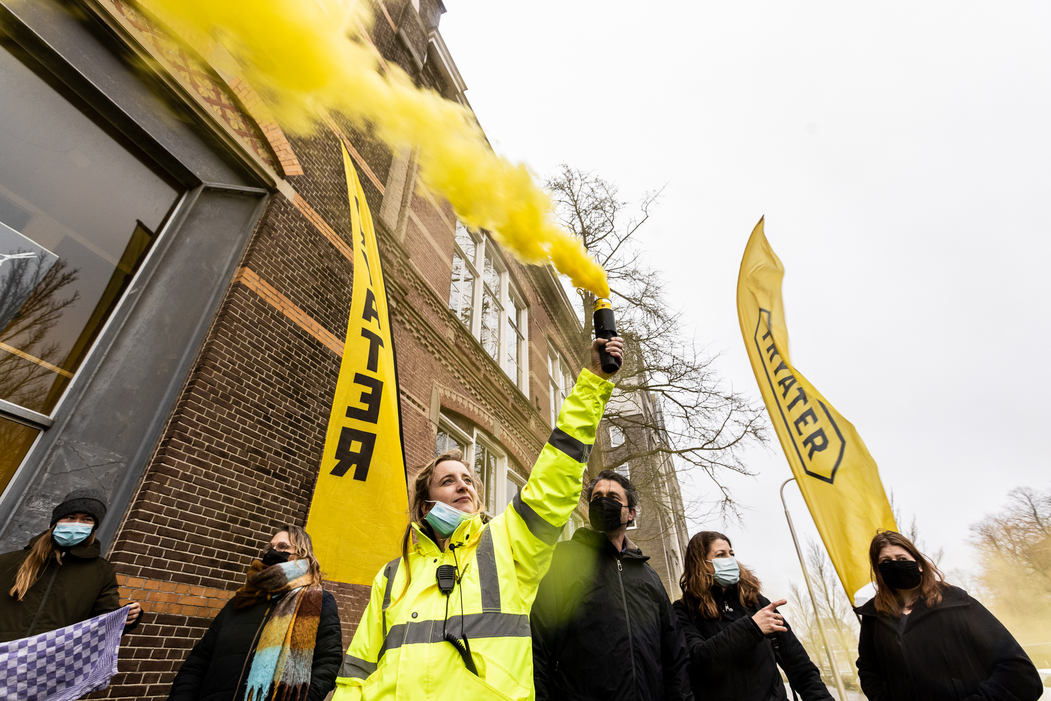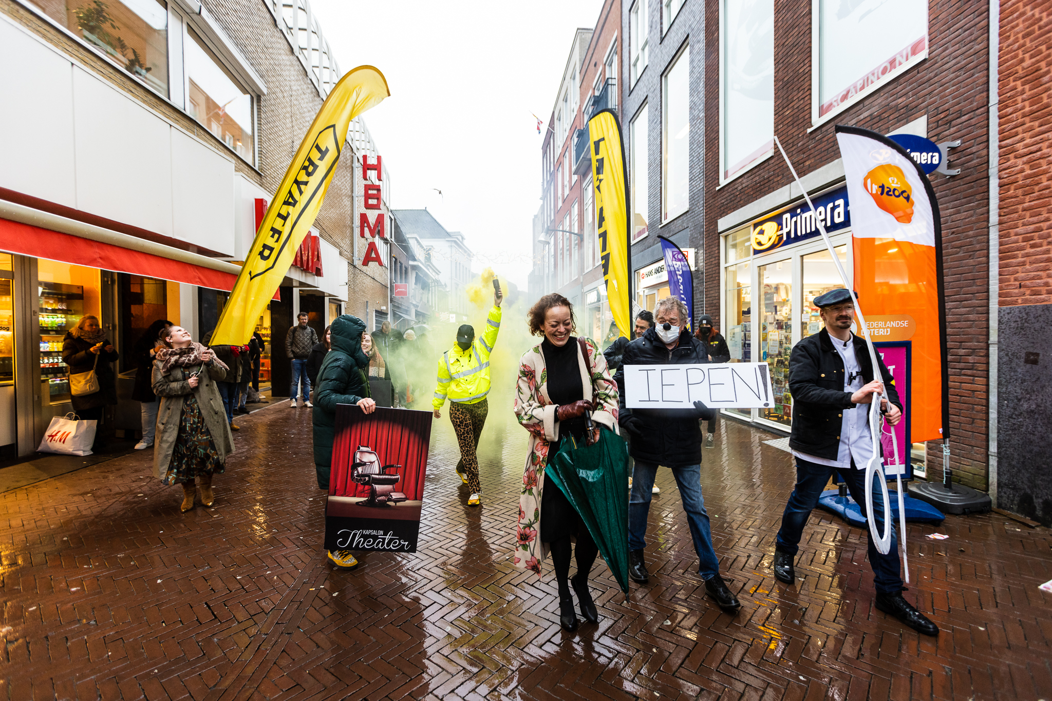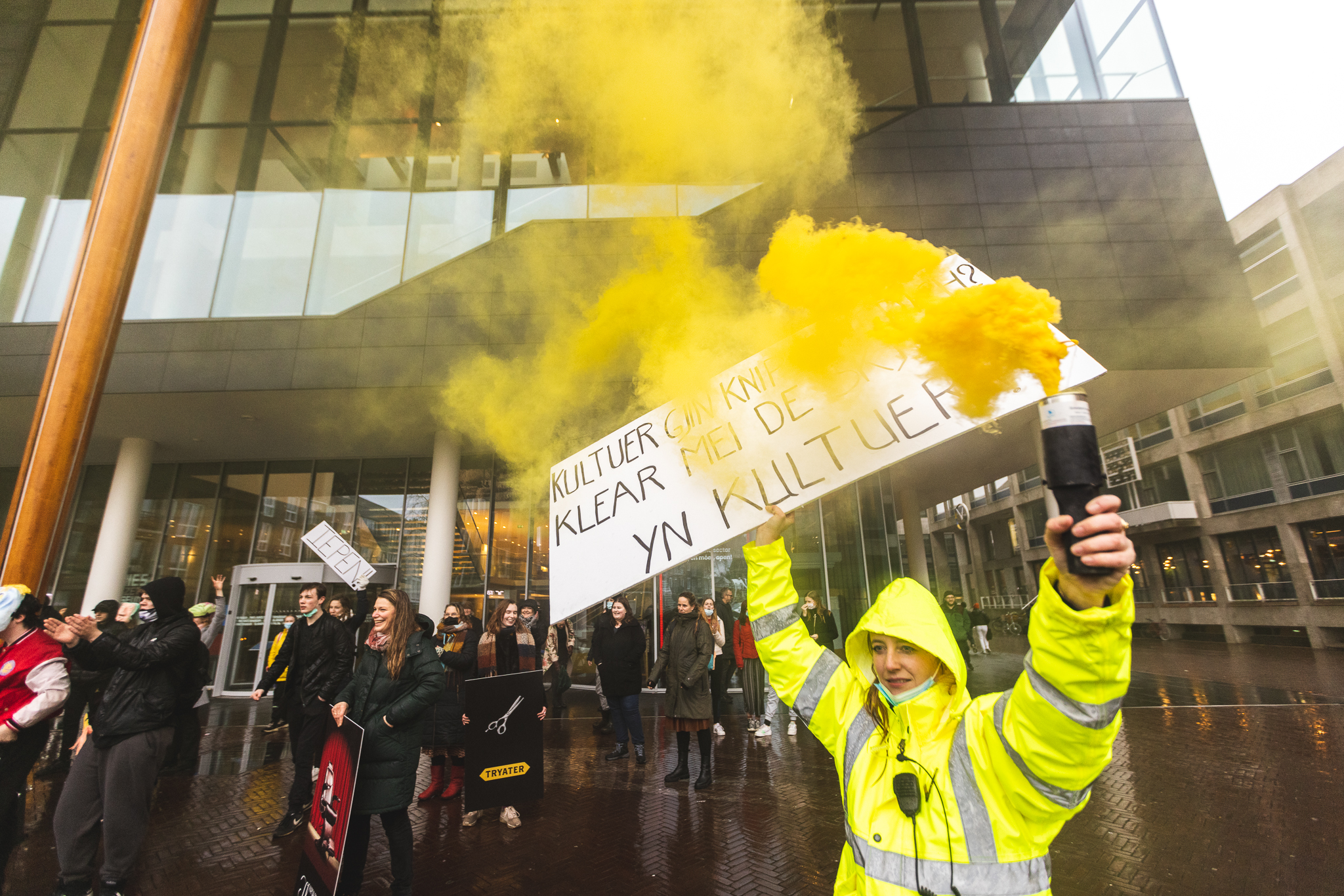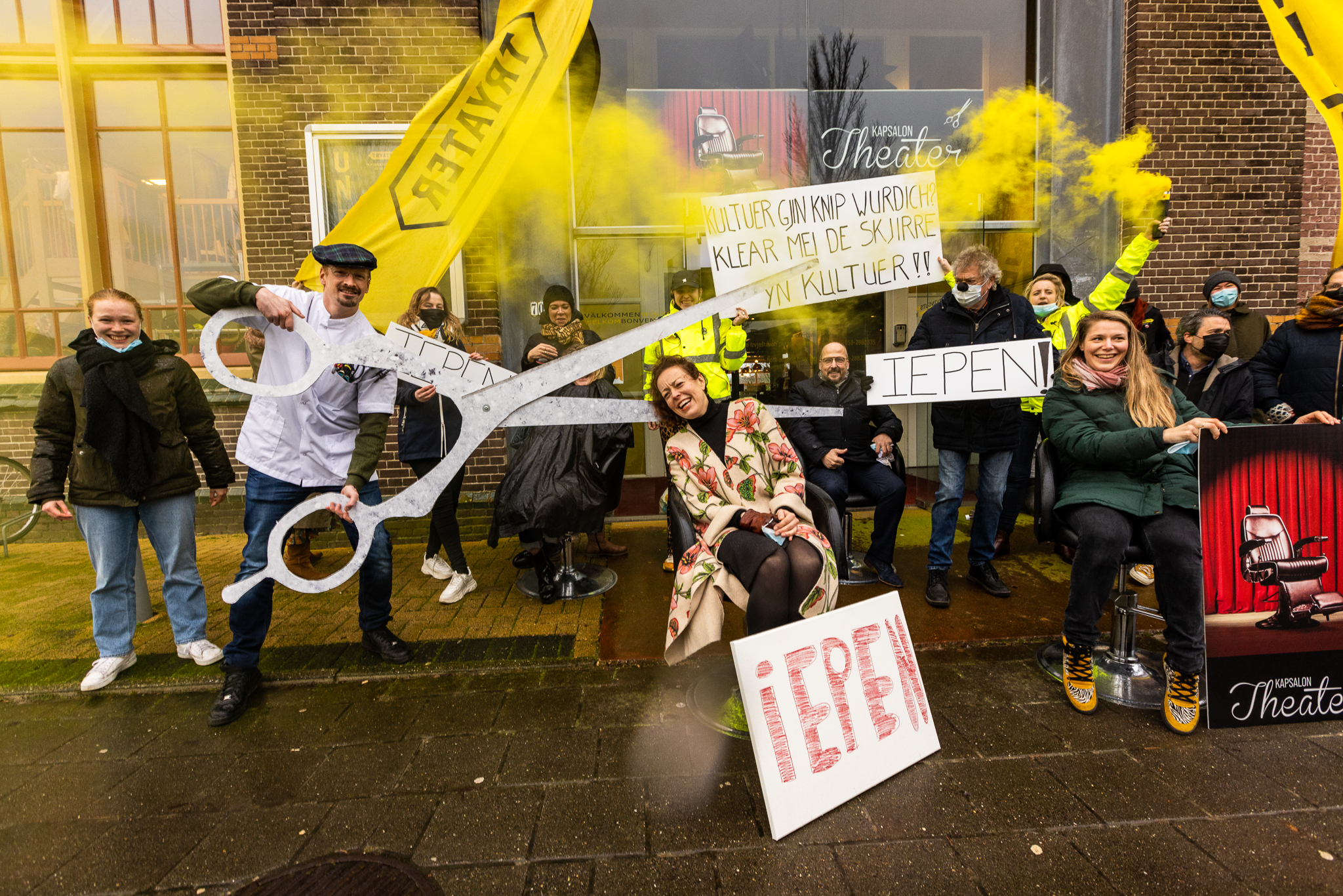 Gewapend met een levensgrote schaar, protestbordjes, Tryater-vaandels en gele fakkels liepen medewerkers, acteurs, kappers en bezoekers vanaf het Tryater-gebouw naar het Wilhelminaplein. Sietske Poepjes, gedeputeerde cultuur van de provincie Fryslân liep mee in de voorhoede. Zij wilde haar steun aan de sector betuigen. Op het plein waren onder meer medewerkers van Neushoorn, Tresoar, New Noardic Wave, Pier21 en de gemeente aanwezig, evenals leerlingen van D’Drive. De toeter van de Tryater-vrachtwagen en het scanderen van de leus ‘Iepen, iepen, iepen’ zetten de korte actie kracht bij.